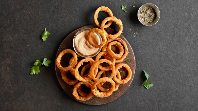 Plus, if you want to amp up your onion rings with some extra flavor, that's easily done. Buttermilk beer battered onion rings are a breeze with pancake mix. You just need your favorite buttermilk-flavored boxed mix and a little bit of beer to mix it with. To give your onion rings more savoriness and depth, add in some garlic granules, or hit your batter with some paprika or cayenne pepper for a little extra spice. Just make sure that you're balancing out the sweetness of your pancake mix with some additional salt, as otherwise, they'll come out way too sugary.