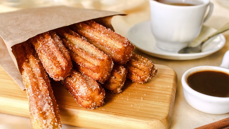 Churros are one of those desserts that's super fun to make, and one that people just don't try to do themselves enough. The truth is that making them is incredibly simple, especially when store-bought pancake mix is involved. Using store-bought pancake mix prevents you from having to measure out all of your dry ingredients, with the formula being ready-made for cooking. Additionally, it's awesome for achieving the puffy, slightly bubbled texture that's emblematic of an awesome churro, with the leaveners activating in the hot oil and creating pockets of air.