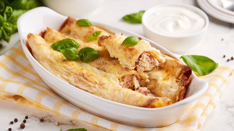What do you do if you want to make cannelloni, but don't have any pasta lying around? You reach for store-bought pancake mix. This may sound like the worst idea in the world, but bear with us and we'll explain. Pancake cannelloni is a fluffy twist on the classic dish, and is an awesome way to use up the leftover pancake mix sitting in your pantry. Instead of stuffing your fillings into tubular pasta, you stuff them into a pancake and roll them up like a burrito, before dousing them with sauce and putting them in the oven.