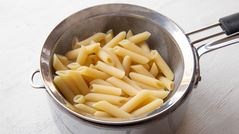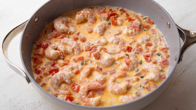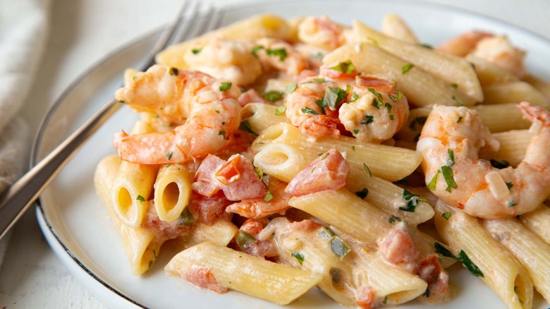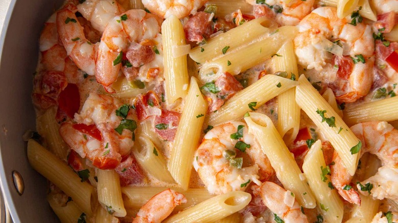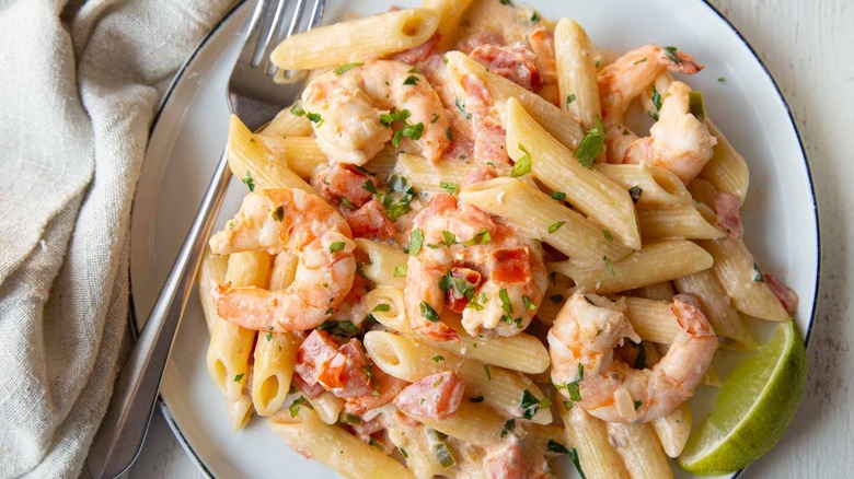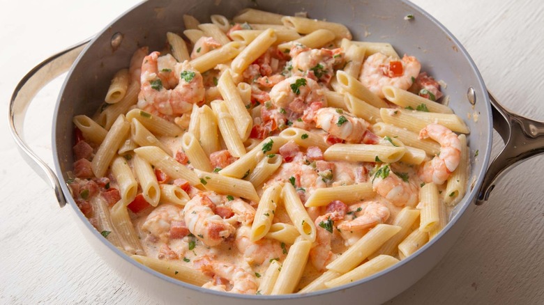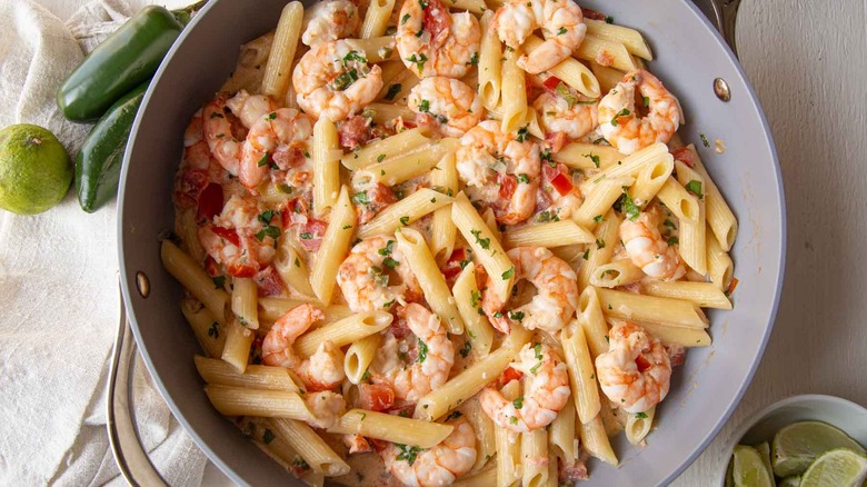 A hearty pasta dish is a versatile and inherently satisfying meal to put on the dinner table. If you're looking for an option that packs in protein, vegetables, and plenty of flavor, this creamy shrimp pasta with pico de gallo is a winner. A fusion of Italian and Mexican flavors, this recipe starts along the same lines as a creamy shrimp penne Alfredo but elevates the dish with the addition of the zesty flavors of a classic pico de gallo. It gets a kick of heat from the jalapeño, juiciness from the fresh tomatoes, and a touch of bright tartness from the lime juice. Nutty herbaceous cilantro replaces the basil you might find in a traditional pasta dish for a surprising and delicious twist. The combination results in an unusual but perfect balance of flavors. Courtesy of Daily Meal recipe developer Kate Shungu, this dish is a quick and easy near-one-pot meal you'll want to add to your weekly repertoire.
