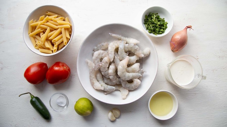 Gather the ingredients for this creamy shrimp pasta with pico de gallo