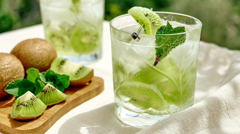 The unassuming kiwi may look like a fuzzy paper bag on the outside, but that just makes its vibrant green interior even more appealing, both to eat and to enjoy as a juice. As is the case with other fleshy tropical fruits, making kiwi juice is best in a blender or food processor, followed by straining out any solids. Believe it or not, you don't even need to peel this fruit before juicing it — the kiwi's edible skin contains a lot of nutrition, so it's beneficial to leave it in, although its brown tone will dull the color of your juice somewhat.