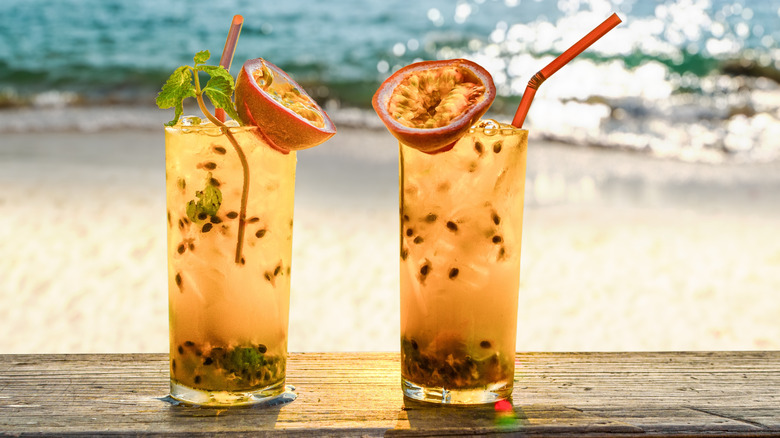 Dealing with fresh passionfruit can be challenging, as the interior of the fruit is so seed-heavy that it takes a lot of them to get a good amount of purée or juice. If you've got a decent amount of them, you can make juice by slicing them in half, scooping out the flesh — seeds and all — and blending it with water. Once blended, strain out the seeds, or leave them in if you don't mind the texture, as they're perfectly edible. Passionfruit juice can work with aged as well as blanco tequilas, as the honey, spice, and vanilla notes of those spirits bring out the fruit's natural sweetness.