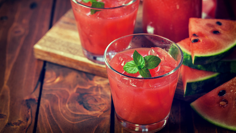 While watermelon and tequila make a perfectly suitable drink combo already, there are some easy ways to elevate the two ingredients to make an even more delicious cocktail. Fresh herbs, especially bright green summery herbs like mint and basil, complement both the juice and the tequila's flavors. Watermelon and salt are a classic duo, so don't be afraid to salt the rim of your watermelon drinks. The sweet melon juice also takes well to heat, so the next time you've got a craving for a spicy margarita, add watermelon juice to the mix.