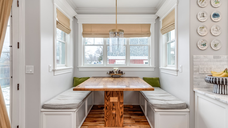 A misconception about breakfast booths is that they must be custom built. In fact, there are ready-made products available. Just be sure to take all appropriate measurements before considering something like this Pemberly Row farmhouse wood corner nook for your kitchen. Some breakfast booth options, like Linon's Harris White Solid Pine Backless Nook with Interior Storage, even offer additional storage space along with seating. Position it below a window for natural light, and add some throw pillows or cushions. And, just like that, you've got the best seats in the house.