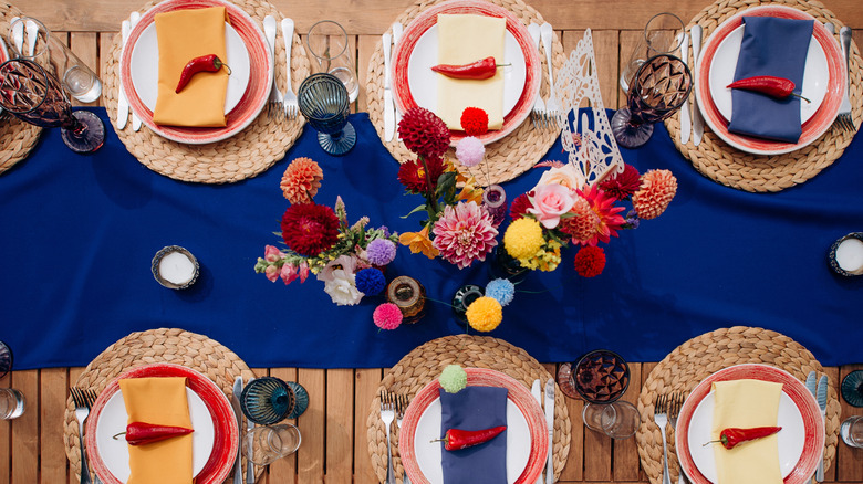 When designing your table, instead of identical chairs around it, you can use a collection of different styles that share a common element, such as material or color. This adds a touch of relaxed charm. The same principle can be applied to linens. A mix of patterned and solid napkins within your color scheme can add texture and depth to the setting, or try multi-color, like this set of 12 cloth napkins from Ruvanti, for a whimsical setting.