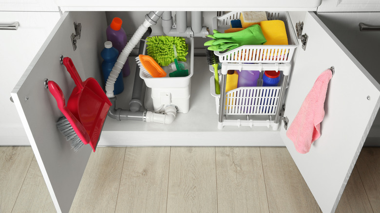 Whether for cleaning supplies or something else, dividing this under-sink cabinet with shelves or racks is another way to optimize the space. If you're hoping to add accessibility, pull-out drawers can be especially useful here as well. There are many options available, but for a reasonable price point online, a choice such as this multi-tiered Realinn Under Sink Organizer has room for just about everything but the kitchen sink.