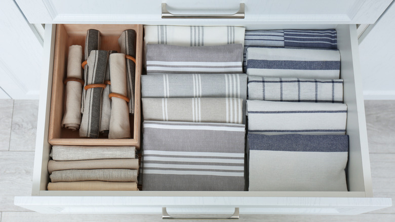 Another kitchen cabinet space-saving hack is to simply reevaluate how everything is currently being stored, to make sure nothing is taking up more space than necessary. Even the smallest of daily-use items can save on space when stored as efficiently as possible. The cutlery drawer is one good example. Even if forks, knives, and spoons are stored in cutlery dividers, they take up even less space when stored on their side rather than flat. This trick leaves room for other utensils that wouldn't fit before. Cutting boards can also be stored more efficiently by using a napkin holder.
