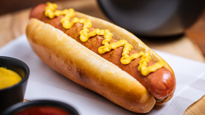 For any kind of beer-simmered hot dogs, sauerkraut makes an excellent pairing. Its tanginess balances out the rich, meaty flavors. You can go all out with a loaded hot dog, or stick to the classic yellow mustard. Either way, the beer-simmered hot dog will already be packed with flavor. If you need help picking a brand, we ranked the 14 healthiest store-bought hot dogs.