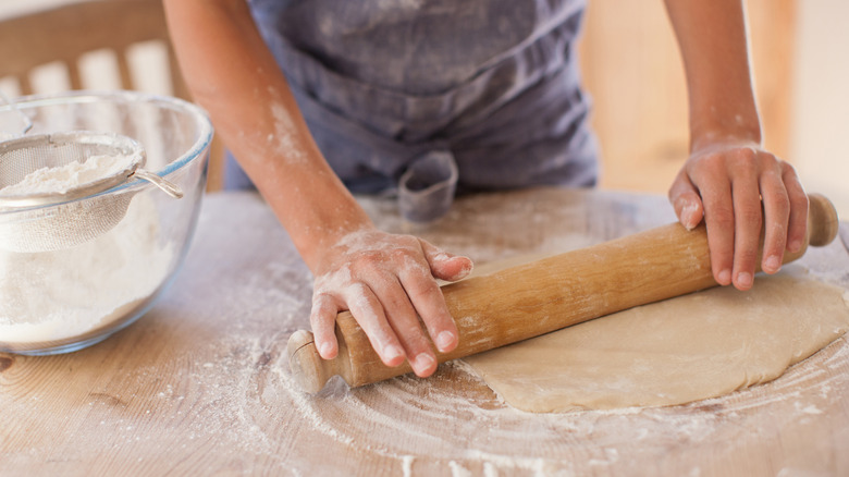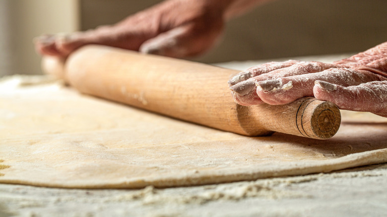 The next step involves enclosing the butter in the dough. To do so, you'll first need to roll the chilled croissant or puff pastry dough out into a large rectangle about triple the length of the butter block you prepared earlier, while ensuring it's also a bit wider. It's best to use a thick wooden rolling pin for this. But there's no need to worry if you don't have one as there are some ways to roll out dough without a rolling pin –- like using a bottle. Also, while rolling the dough make sure not to dust the surface with too much flour, because as noted, the excess will dry it out. I'd also recommend working in a cold room to further reduce the chances of the dough getting tacky and difficult to work with.