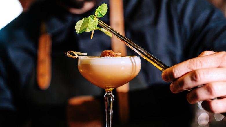 An espresso martini made using the traditional four-ingredient recipe makes its own foam cap, just like a perfectly poured cup of espresso is topped with a white crown of crema. However, if your coffee is too old, you haven't shaken hard enough, or you've used too little ice, your foam cap might look more like a soap scum ring. That's a less-than-appealing quality when it comes to espresso martinis, but luckily, there are multiple bartending tricks you can use to always ensure your foam is the crème de la crème.