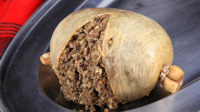 Haggis is leftover sheep scraps cooked in a sheep's stomach. With an introduction like that, it's no wonder Guy Fieri freely admitted to avoiding the food for years. Haggis, after all, is full of parts of the animal he hates: heart, liver, tongue, and anything else that falls under the offal umbrella. When he finally tried the Scottish delicacy, his distaste was evident, but he did concede that the food had good seasoning and wasn't as scary as he thought it was going to be.