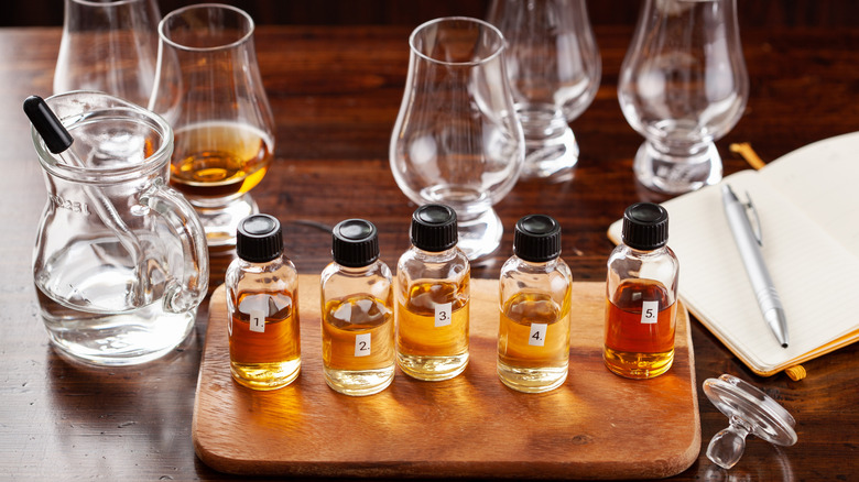 Let's be clear that whiskey tastings should always be fun — but they should never be too much fun. The spit and dump bucket is there for a reason: No matter how much you've eaten or how small your pours are, indulging in too many spirits in a row can quickly get you intoxicated. At the very best, this will inevitably make it harder to reliably taste what you're drinking. At the very worst, it can also put you in a very dangerous situation of overconsumption. As always, pay attention to your body and take note of how you feel as you work your way through your samples, taking plenty of opportunities to pace yourself or take a break for some water. Once you've finished your tasting, feel free to go back and fully enjoy your favorites from the lineup instead of feeling the pressure to down everything as you go along.