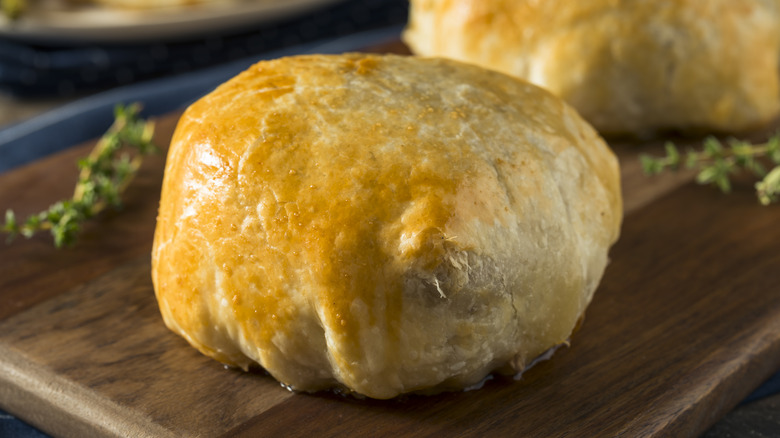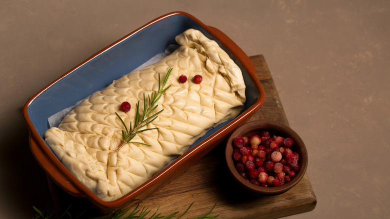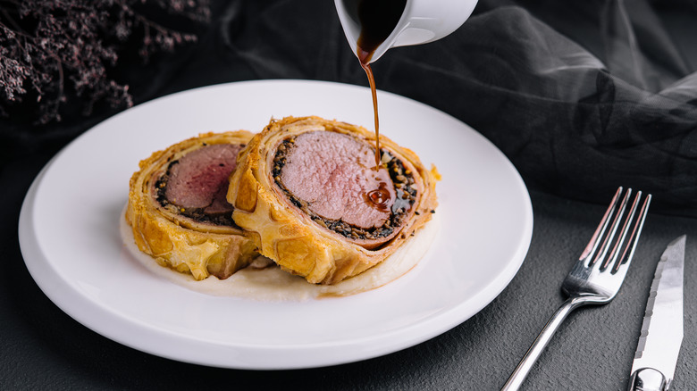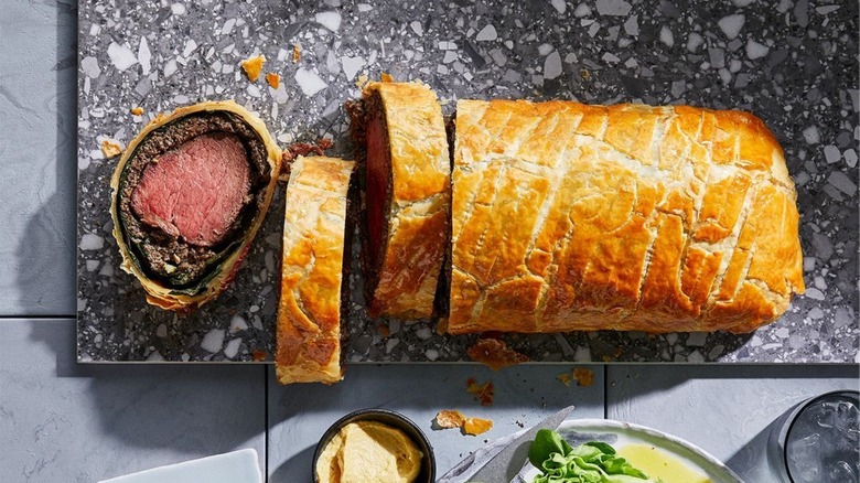 While there are a number of variations on a classic beef Wellington — including vegetarian versions made with butternut squash, and ones featuring budget-friendly meatloaf — the real deal is made from beef tenderloin. This cut is ideal for this recipe because it is exceptionally tender and has a uniform shape in its center-cut, which is often used. Sourced from along the backbone of the cow, its tenderness comes from being a non-weight-bearing muscle. To prevent it from drying out, it's typically cooked to no more than medium-rare doneness.