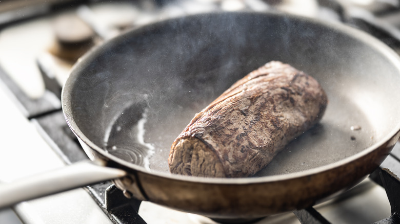 To sear the meat, make sure it has been thoroughly patted dry before seasoning. The tenderloin should be seared in a touch of oil in a very hot pan over high heat. It is crucial that the tenderloin be seared uniformly across its entire surface so it cooks evenly. And don't leave the meat in the pan for too long — you aren't trying to cook the inside of the tenderloin, just to develop a deep brown color and crust on its exterior.
