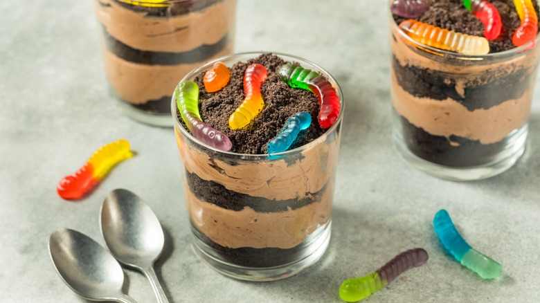Desserts are inherently luxurious, so sometimes a little whimsy is in order. Sweet treats simply taste better when there's a fun little gimmick associated with them. Dirt cake and its single-serving sibling, dirt pudding, is a concoction made from chocolate cake, whipped topping, and gummy worms. There are plenty of other ingredients, of course, but the dirt, mud, and worm components are most important. Gummy worms were invented in 1981, some 60 years after the first gummy bears appeared on store shelves. With the arrival of gummy worms, it was only a matter of time before someone thought up something like dirt pudding.