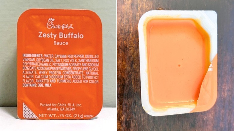 The Chick-fil-A Zesty Buffalo Sauce is the chain's offering to hot sauce enthusiasts. It has an allergen warning for egg and milk, which is something for those with allergies to be aware of. Opening the container, you're greeted with an almost milky orange sauce with no discernible bits inside — although mine did have quite a few air bubbles. The smell was a giant kick in the face of pure heat that made my eyes water a little.