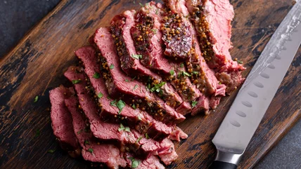Most corned beef is traditionally made with brisket, a less-expensive, tougher cut of meat coming from the lower chest area of the cow. The beef is cured or soaked in a brine made with pickling spices such as mustard seeds, bay leaf, juniper berries, whole cloves, brown sugar, coriander seeds, peppercorns and curing salts or sodium nitrate for seven to 10 days. At Old World-style delis throughout the U.S., recipes with unique ingredients and proportions — not to mention the curing times, which can last up to several weeks — create singular flavors and textures. The beef is then rinsed and cooked, even in corned beef recipes that don't use hash or cabbage.