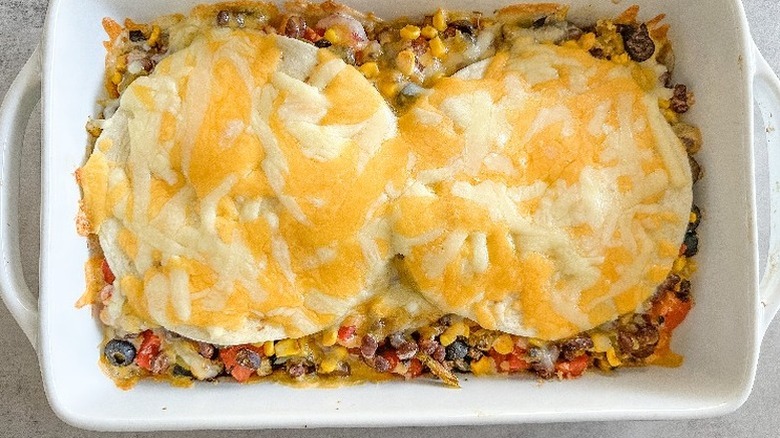 The best way to describe this dish is as a lasagna with a little Latin flair. It features tortillas as de facto noodles and is incredibly simple to throw together in a pinch, making it the perfect easy weeknight meal.
