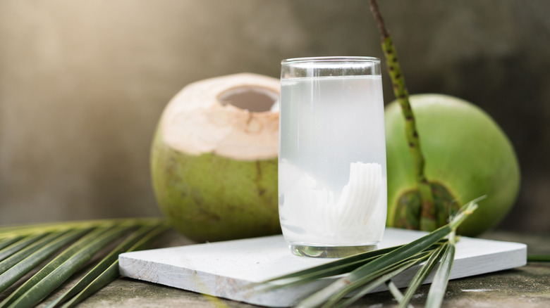 If you've ever bought into the idea that coconut water can prevent a hangover, this next one's for you. Not only will the combo of coconut water and bourbon provide you with some of the electrolytes you need to stave off a headache, mixing the two together will provide an interesting take on the classic duo of whiskey and water. A dash of coconut water can pull the acrid intensity out of your bourbon, while simultaneously awakening some of its sweeter notes. The lightly tropical flavor that coconut water provides also gives your drink just that bit more excitement, and its brightness helps to awaken the bourbon's vanilla tones. It also has enough flavor to make a slightly longer drink, although you might want to add some syrup if that's the case to create a bit more intensity.