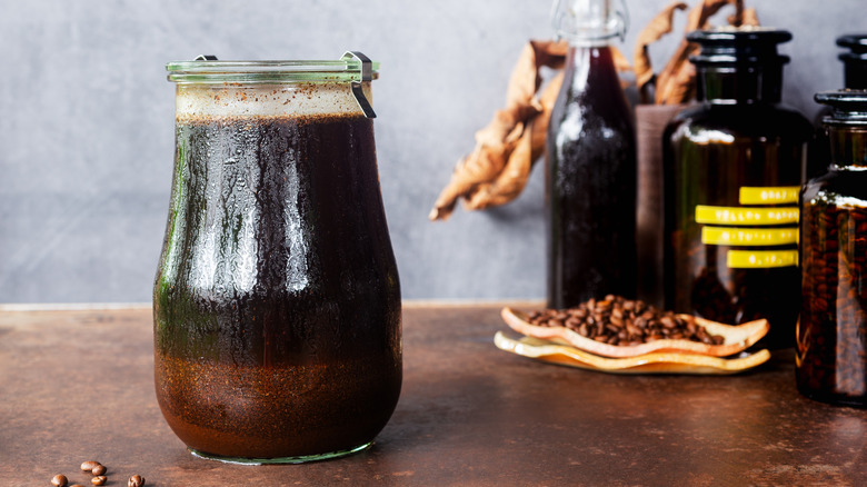 Anyone who's ever had an Irish coffee will tell you how well the taste of whiskey and everyone's favorite breakfast drink go together. However, most people enjoy the combo warm — and we're a bigger fan of opting for cold brew. Using cold brew as a mixer leans heavily into the coffee notes of bourbon, and somehow helps unlock its sweetness a little more, with the bitterness of the coffee underpinning the rest of the flavor profile. Cold brew also has a chocolatey intensity that hot coffee sometimes doesn't exhibit as well, which helps to make the combo of the two just that bit more mellow. You'll also probably find that drinking it burns your throat less, which is always a pretty good thing.
