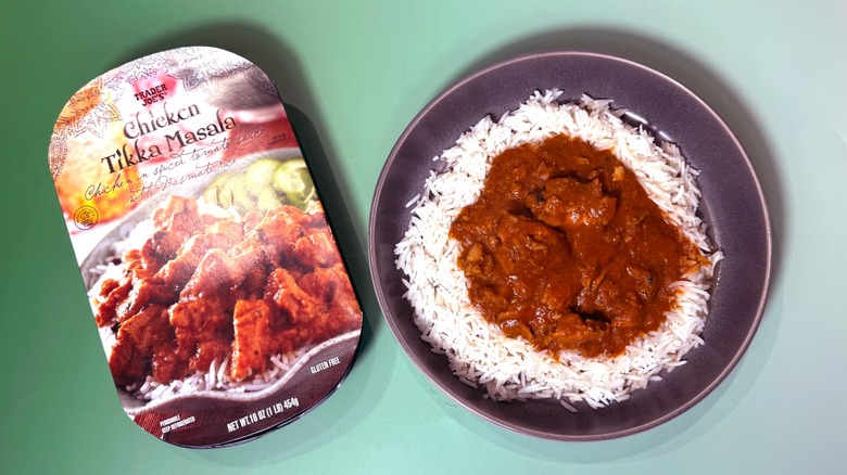 While all of the other items featured here are either frozen or shelf-stable, I found Trader Joe's chicken tikka masala in the refrigerated section. There is a frozen version, too, but it wasn't available at my location. This meal comes in a divided container with basmati rice on one side, chicken and sauce on the other. There's a lot of rice in the package, and it's completely unflavored and unseasoned, which makes this a questionable value given that it's the most expensive item on this list.