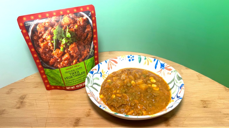 While the word "tikka" in Indian cooking simply means small bits or morsels, it can also refer to the preparation of these morsels — meat, cheese, or vegetable pieces — in a spice-laden marinade. Here in Trader Joe's tikka vegetables dish, peas, carrots, corn, and potatoes simmer in a sauce of tomato and cream that's packed with heat and flavor.