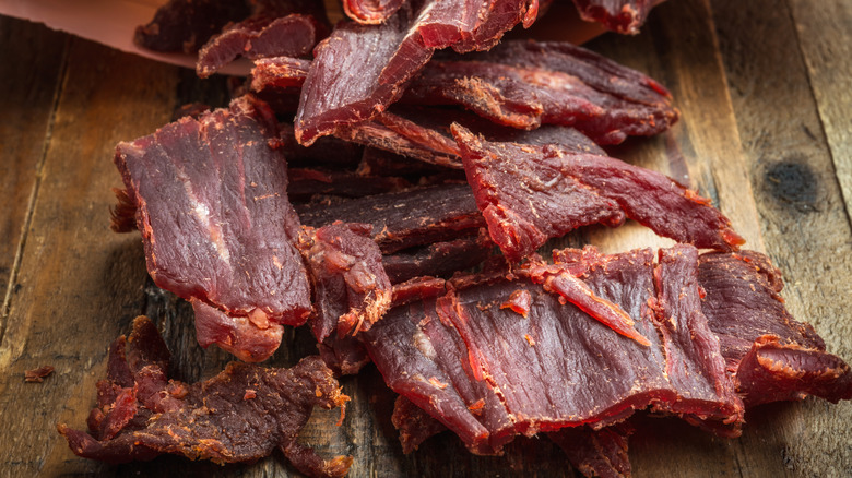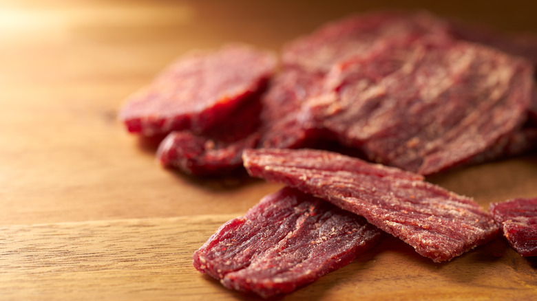 Beef jerky is one of those foods that seems to defy logic. The concept of eating aged, dried beef that's been sitting at room temperature for weeks without any risk to health can seem a little frightening to some folks, who likely have been brought up to fear eating anything older than a few days. However, the truth is that beef jerky can provide you with a filling, protein-rich snack that's perfectly safe to consume — most of the time, anyway.