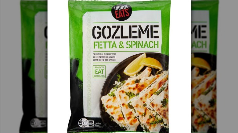 This one might have a strange name to readers in United States: Fetta & Spinach Gozleme. Let's break it down, starting with the "gozleme" part. Maybe the easiest way to explain gozleme is that it's like a Turkish quesadilla. Instead of tortillas, of course, the wrapping is flatbread. Grilled flatbread? Already, we're interested. It has to be stuffed with something, of course. Filling can vary, but we're especially intrigued by the cheesy, vegetarian fetta and spinach version sold at Aldis in Australia. Savory, slightly bitter spinach combining with the funkiness of fetta cheese is an all-timer of a combination. Maybe you're used to have a few pinches of these ingredients in a salad, but they shine bright as a duo in applications like this.