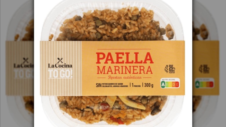 Anyone who loves rice should want Aldi Spain's grab and go version of paella on shelves in the United States. Now, we should be upfront: Calling this meal, which is essentially seafood rice in a plastic container, "paella" seems like something of a stretch. Paella is a wonderful dish with such a ritualized preparation that it merits the use of its own special pan. That pan is necessary because its massive surface area enables the bottom of the rice to get beautifully crispy. The size of the pan is because paella is meant to be shared, ideally amongst loved ones. Sometimes, though, you don't have time for all that, and you just want some paella to go.