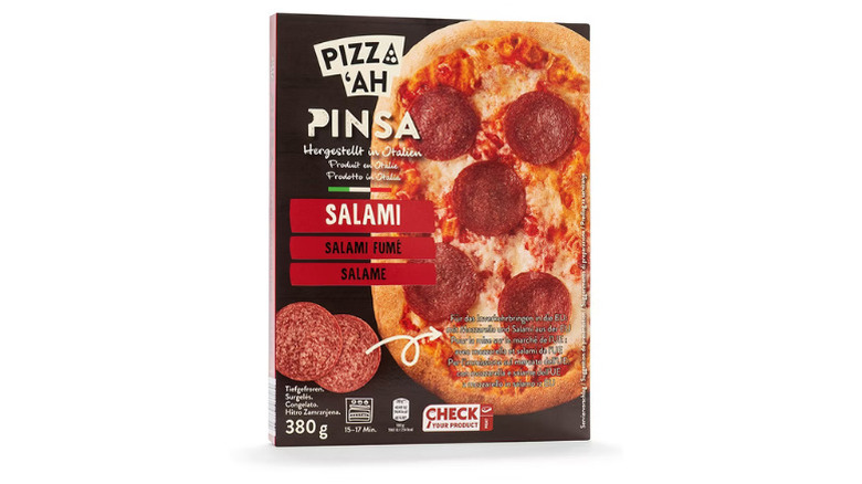At Aldi in Austria, the PIzz'ah Pinsa label sells salami pizza. Now, sure, somewhere in the U.S., somebody is putting salami on a pizza. It's not like this is the most wild, out-there idea, invented during the most advanced of molecular gastronomy experiments. The question here is, why can't we find salami on a grocery store frozen pizza? Specifically, an Aldi frozen pizza? Well, you can, if you live in Austria. Frankly, we're jealous. The Pizz'ah Pinsa label has a few other varieties that pique our interest, like the grilled vegetables pizza featuring mushrooms and peppers or the Margherita Pizza. That salami, though. That's the one that's got us drooling all over the keyboard.