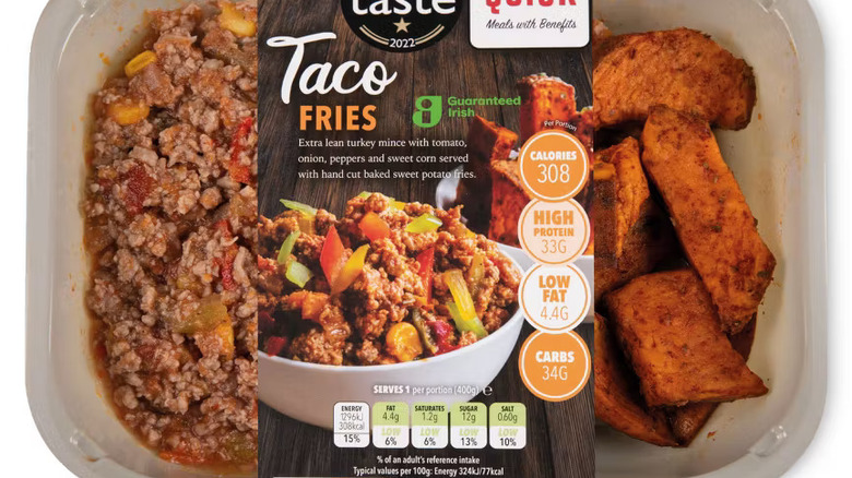 At Aldi in Ireland, you can buy something called Taco Fries. This pre-made treat appears to be big potato wedges accompanied by a dip made with ground turkey, onion, peppers, and corn. Literal meat and potatoes from the Emerald Isle, but with a Mexican twist. We're more than intrigued by this idea. Judging by the picture, those fries are thick enough to handle all of that ground meat, which seems to sit in a tomato-based sauce. Is it better to dip one fry at a time? Should two fries be used, like salad tongs or even chopsticks, to grab big hunks of taco dip? We'd sure like to find out.