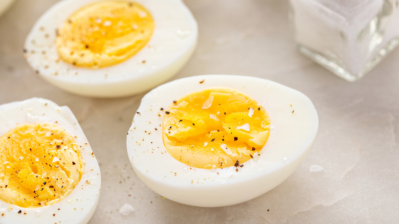 Still, there are plenty of other ways to make a hard-boiled egg more exciting. All of which are easy enough to do late at night when a craving hits. For example, there are other seasoning blends that will be just as delicious on boiled eggs as all-purpose seasoning. Add Tajín, a Mexican seasoning blend made of ground dried chili peppers, dehydrated lime, and sea salt, for a tangy, mildly spicy kick. In fact, we listed breakfast foods (which easily includes hard-boiled eggs) in our list of the best foods and drinks to top with Tajín. We also think that one of the best ways to use everything bagel seasoning is to enhance egg dishes — including hard-boiled eggs. Everything bagel seasoning adds nutty, garlicky, savory notes that make the eggs an even more delectable late night snack.