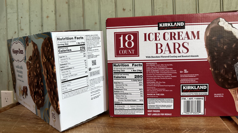 When reading the box of Haagen-Dazs ice cream bars, you may notice that each bar is listed as weighing 3 ounces. In contrast, the Kirkland Signature box states that its bars weigh in at 3.1 ounces. At first glance, this tenth of an ounce might seem small and barely worth mentioning, but it's hard not to interpret it as a subtle one-up from Costco.