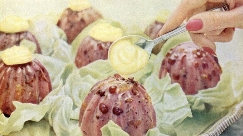 Another entry on this list with soufflé in the name but nothing to do with the delicate baked dish, Monterey soufflé salad wasn't exactly the most well-known vintage salad. But, it's safe to assume that it did have its admirers. Two recipes for this salad were released in 1955, one by Star-Kist and the other by Hellmann's/Best Foods. Both recipes were exactly the same and of course, each of them recommended using Star-Kist Tuna and Hellmann's or Best Foods Real Mayonnaise.