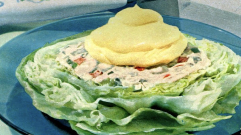 Although the name may suggest a healthy dish, deviled lettuce salad wasn't even close to being that. These days lettuce is loved for being nutritious and a wholesome base for salads — be it iceberg, romaine, or even the underrated red lettuce that you should consider using. However, deviled lettuce salad instead turned the leafy veggie into an exceptionally unhealthy creation. Not to mention it used lettuce in a rather unusual manner. The recipe for this salad was released by Kraft back in 1962, possibly to market their Miracle Whip salad dressing.