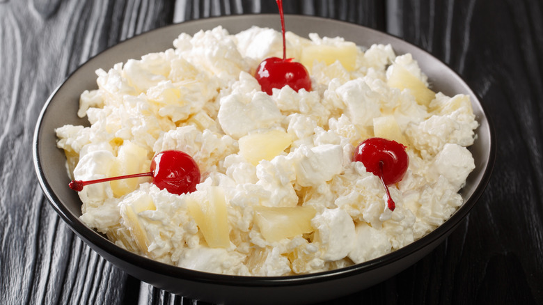 Rice isn't the first ingredient that comes to mind when thinking of salads, but glorified rice is a vintage recipe that turned the humble starch into a sweet salad creation. The most prevalent version of glorified rice featured boiled white rice, sliced grapes, marshmallows, diced pineapples, and honey or sugar for a zest of sweetness. All of these were mixed with whipped cream and garnished with maraschino cherries. However, there were also a few recipes that included other diced fruits, nuts, and sometimes, even Jell-O.