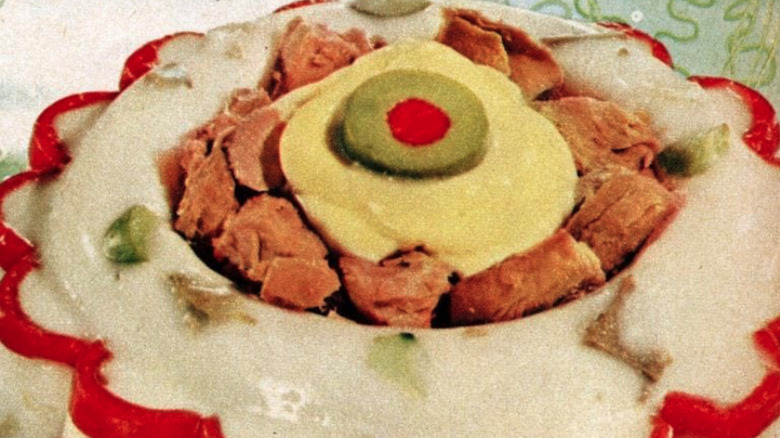 Two notable examples of savory Jell-O salads featured in the cookbook were Sea Dream and Ring Around The Tuna salads. The Sea Dream salad was made with lime-flavored Jell-O and some veggies, then topped with cooked shrimp, which is arguably still palatable as the seafood wasn't mixed with the jelly. The Ring Around The Tuna salad, though, featured a lime Jell-O base that was loaded with diced cucumbers and celery, sliced stuffed olives, grated onions, chopped pimento, and the star (albeit infamous) ingredient that gave it most of its flavor — canned tuna. These savory-sweet jiggly salads can still be found in some parts of Utah, as they are a staple in Mormon cuisine. However, savory Jell-O salads have gone out of style almost everywhere else in the country.