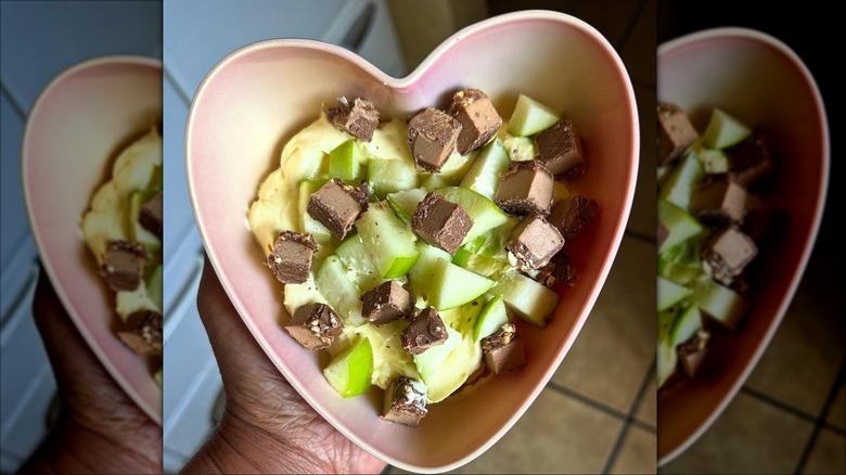 A few dishes make you wonder if they were created by a child. Snickers salad is one of them, as it is sweet, creamy, and totally decadent. The main ingredient in this salad was, no surprise, chopped up Snickers bars. Mix up some Cool Whip and Granny Smith apples with the candy bar pieces and you'd get the most simple version of a Snickers salad. Another uncomplicated variation included the same three ingredients, plus instant French vanilla pudding and milk.