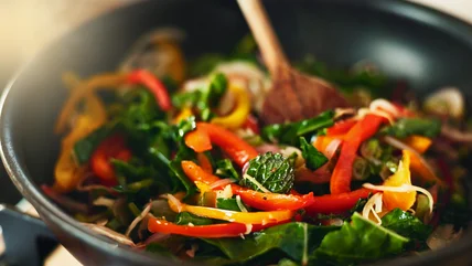 Before you start throwing your stir fry together, it is important to remember that canned tuna is not raw; it has already been cooked. You do not want to let it cook for more than one to three minutes tops. The goal is to have it just heated through, otherwise it may quickly turn from tender to tough, and no one wants a chewy mouthful of tuna. Tuna also goes with just about any veggie you have in your fridge. Cabbage, peppers, and onions work well in a tuna stir fry, as do carrots, Swiss chard, broccoli, and even snow peas.