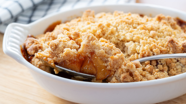 It's true that predecessors of the crumble existed well before the 1940s, but variations on this simple dessert — cooked fruit covered in a crumbly topping — were less desirable than cakes and pies during times when there was no shortage of sugar, butter, or pastry flour. The apple crumble didn't become widely consumed until food scarcity during WWII necessitated the adaptation of go-to recipes. The crumble was a reimagining of the apple pie in the UK when rationing and food shortages were at their peak.