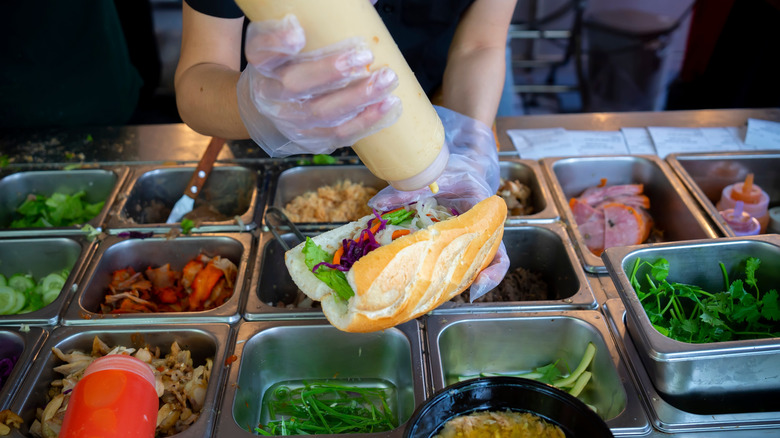 Banh mi is a sandwich with ties to the history of French colonial rule in Vietnam. When the French arrived in the mid-1800s, they brought their dietary customs with them. This consisted of a lot of bread and cured meat, two things foreign to the locals' diet. Wheat was imported, making bread — typically consumed as baguettes — an expensive commodity locals couldn't really afford until WWI. This was when many French left Vietnam to partake in the war effort, leaving behind a surplus of imported goods, including bread and cured meats. Once locals got a taste for bread, it quickly became a staple, though shortages led to recipes made with varying percentages of rice flour. Locals continued to eat this bread with butter and cured meats à la Française.
