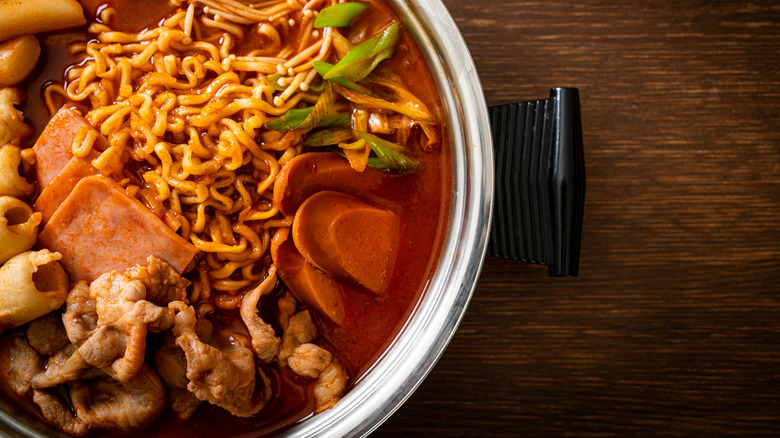 This popular stew enjoyed the world over is an enduring fusion dish born out of wartime necessity. Its origins come from the Korean War, when food scarcity prompted locals to seek out the only places that didn't have food shortages — American army bases. This is where locals lined up to purchase the leftovers from the army mess, often scraps that were intended for the trash. What these scavengers came away with were processed foods, especially meats like SPAM and hot dogs, that didn't spoil easily. They mixed these savory protein sources into vegetable soups, adding their own twist of flavor with Korean spices. The dish became known as budae jjigae, or "army base stew."