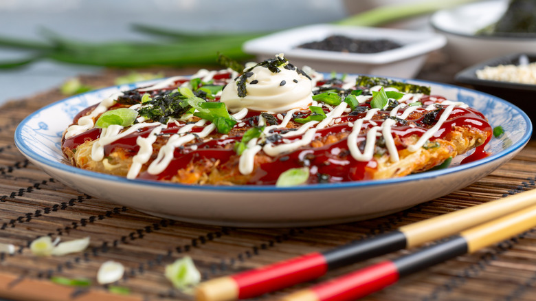 Okonomiyaki, a Japanese savory pancake topped with a generous helping of invariable toppings and a decadent sauce, is a dish to which two cities lay claim. Osaka is where the dish got its name, but Hiroshima's version is the one that is best known today. While variations date back to Japan's Edo Period, okonomiyaki didn't transform into the beloved staple it is today until necessity struck in 1945. When the United States dropped the Atomic bomb on Hiroshima, the result was catastrophic devastation, and an unparalleled food scarcity for those who survived the blast. Salvaging pans from the wreckage, locals relied on whatever they could easily find to eat, and the result was adaptations on the extant concept of savory pancakes — a mixture of flour from U.S. rations topped with simple, hardy vegetables, like cabbage, and whatever else was available.