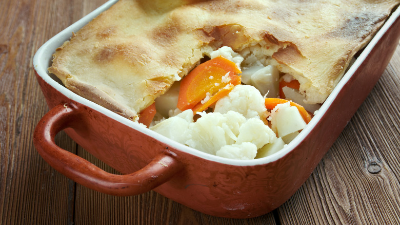 The savory pie is a simple mixture of seasonal vegetables thickened with oatmeal and cooked beneath a pastry topping, then served with brown gravy. Containing no meat, it was a shift from the heftier savory pies that made up traditional British fare, but deemed to have all the necessary nutrients that could keep the home front fighting fit. Though the recipe is infinitely modifiable depending on the vegetables in season, any appreciation civilians may have had for the dish during food shortages did not grant the Woolton pie much longevity beyond wartime. Today, steak and kidney or shepherd's pie are more highly prioritized as traditional British foods worth trying, and typically picked over meatless alternatives. Nevertheless, the Woolton pie remains a simple vegetarian recipe that's easy to reproduce.