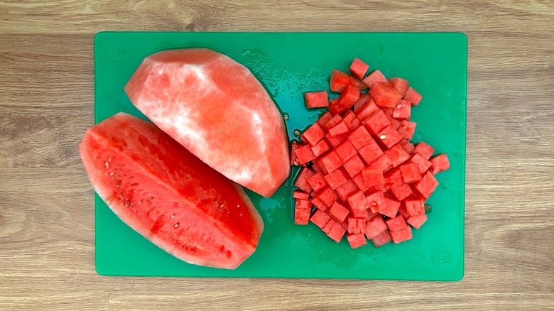 When it comes to safety and ease, any watermelon cutting method where you can dispose of the rind before hacking into the meat of the fruit is going to be preferable to one where the rind remains intact. For this reason alone, cutting it into cubes is a great idea. This is also the preferred method if you are planning on using the melon in a recipe, like a salad, salsa, or a tequila-soaked summer treat.