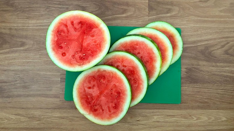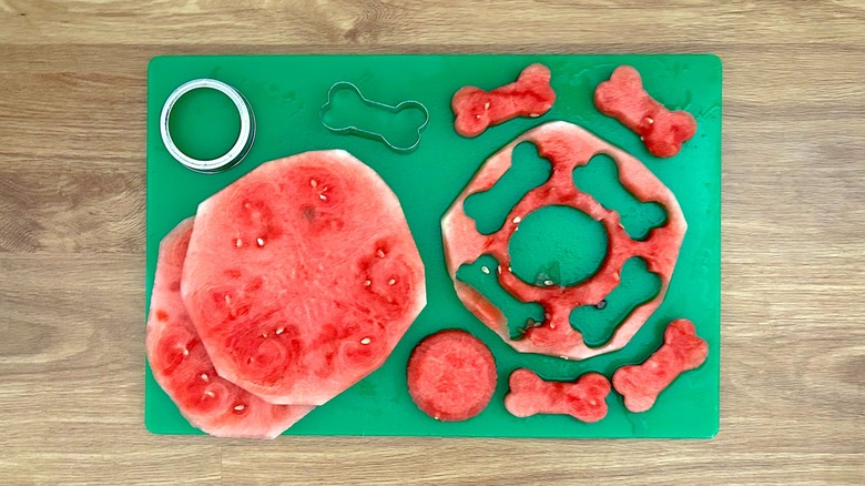 The technique for this is fairly straightforward. Start by removing the ends of the watermelon and then peel it, as if you're going to cut it into cubes. Once peeled, slice the melon into ½-inch rounds and then use the shape of your choice to cut out pieces of watermelon. Serve these as-is, or as a pro-level cocktail garnish for your favorite summer libation.
