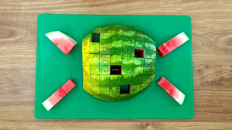 If your goal is to carve a watermelon that's easy to eat as-is for a summer cookout or as a snack for the kids after they get out of the pool, the stick method is the most functional technique. Not only is it quick to execute, it results in little to no waste. It also allows the watermelon to be consumed without a utensil while minimizing the amount of clean up involved. That's a win-win in my eyes.