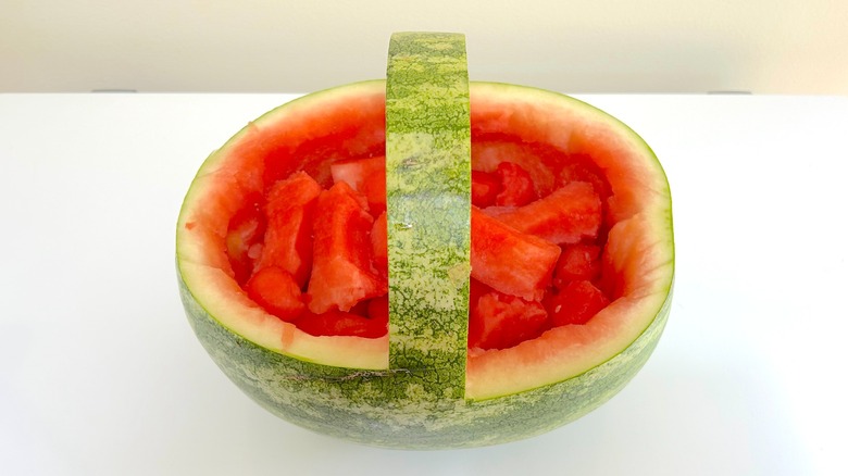 Then I carefully scored the watermelon along the midline and up the handle, creating two triangle pieces that were relatively easy to remove and carve into wedges or cubes. Getting the meat out of the base of the watermelon was another story altogether. While you can score around the edge of the watermelon and scoop out slices of meat, they aren't very consistent or pretty. You are almost better off using a melon baller, and even then you'll have to dig the remaining flesh out to create a clean basket.