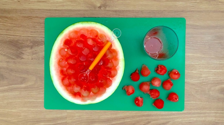 One downside to this process is that you may end up with some waste, as it can be hard to get perfect balls without damaging some of the watermelon. The upside? Lots of juice. As you scoop out the balls, you will notice the watermelon half filling up with liquid. Don't discard this liquid gold. Not only is it a hydrating and refreshing beverage, it's fantastic for making ice cubes, adding to cocktail recipes, or turning into a frozen treat, like a popsicle.